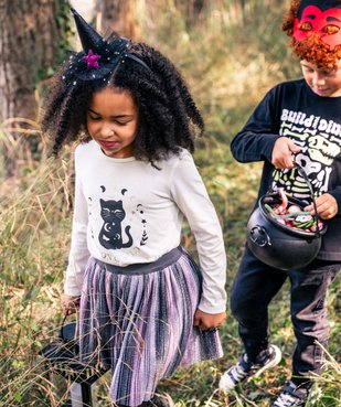 Si votre enfant souhaite se démarquer en portant comme tenue de fête un costume personnalisé, vous trouverez également le nécessaire à prix doux dans notre sélection Halloween. Laissez-vous tenter par un large choix de tee-shirts fille et tee-shirts garçon sur des thèmes variés. Au programme, haut à manches longues ou courtes décorés de calaveras fleuris, d’araignées facétieuses ou de petits chats magiques. Mais aussi des tee-shirts animés avec des motifs squelettes phosphorescents ou des chats noirs en sequins brillants. Des chouettes tops, à coordonner avec des accessoires fantaisie – comme un serre-tête oreilles de chat, par exemple – et un jegging ou un jean noir. À retrouver dans notre sélection Halloween pour enfants. Le plus : ces vêtements pour fille et pour garçon sont faciles à reporter le reste de l’année.